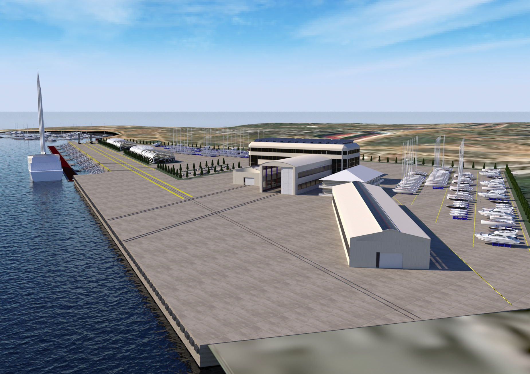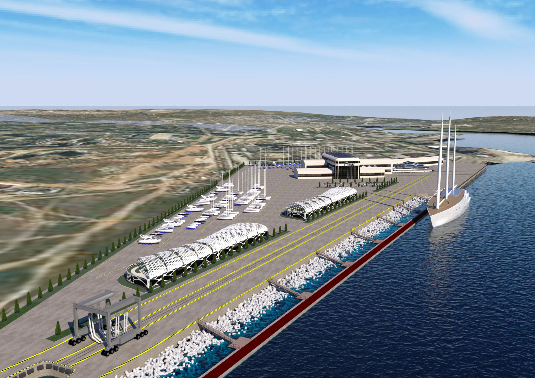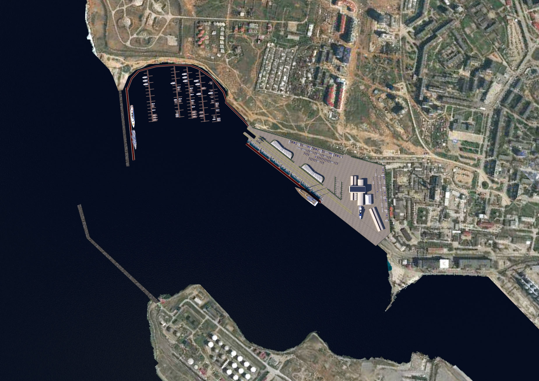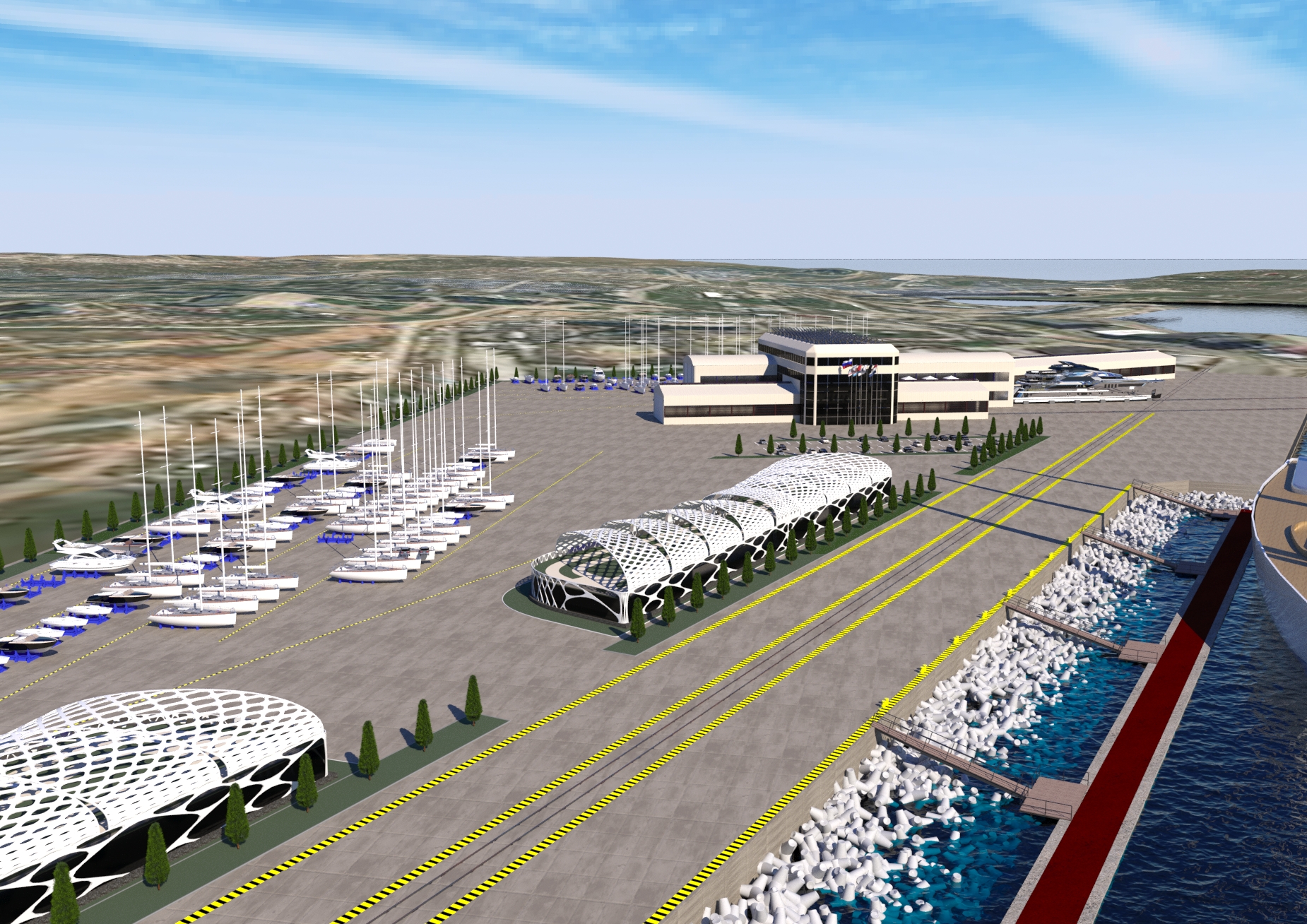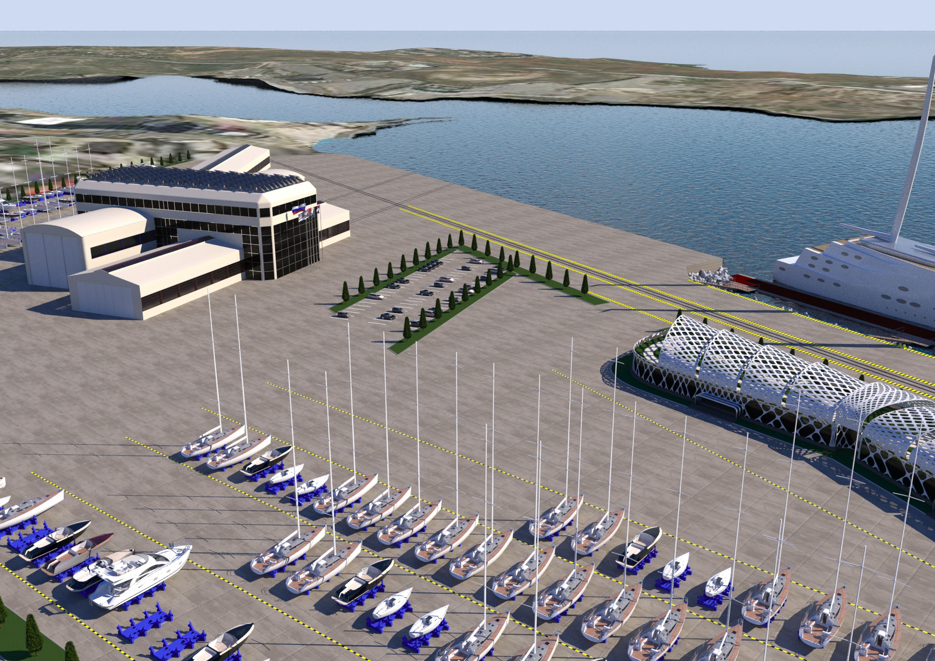 NAME PROJECT: "Kamysh Yachting Hub" includes: marina, yacht service center. . MANAGEMENT & ENGINEERING: YRoyalYachts Naval Architect&Marine Engineering Center ARCHITECTURE & DESIGN : YRoyalYachts Naval Architect&Marine Engineering Center  Length overall 400 m Width 400 m Capacity 500 places Ground storage - up to 600 yachts