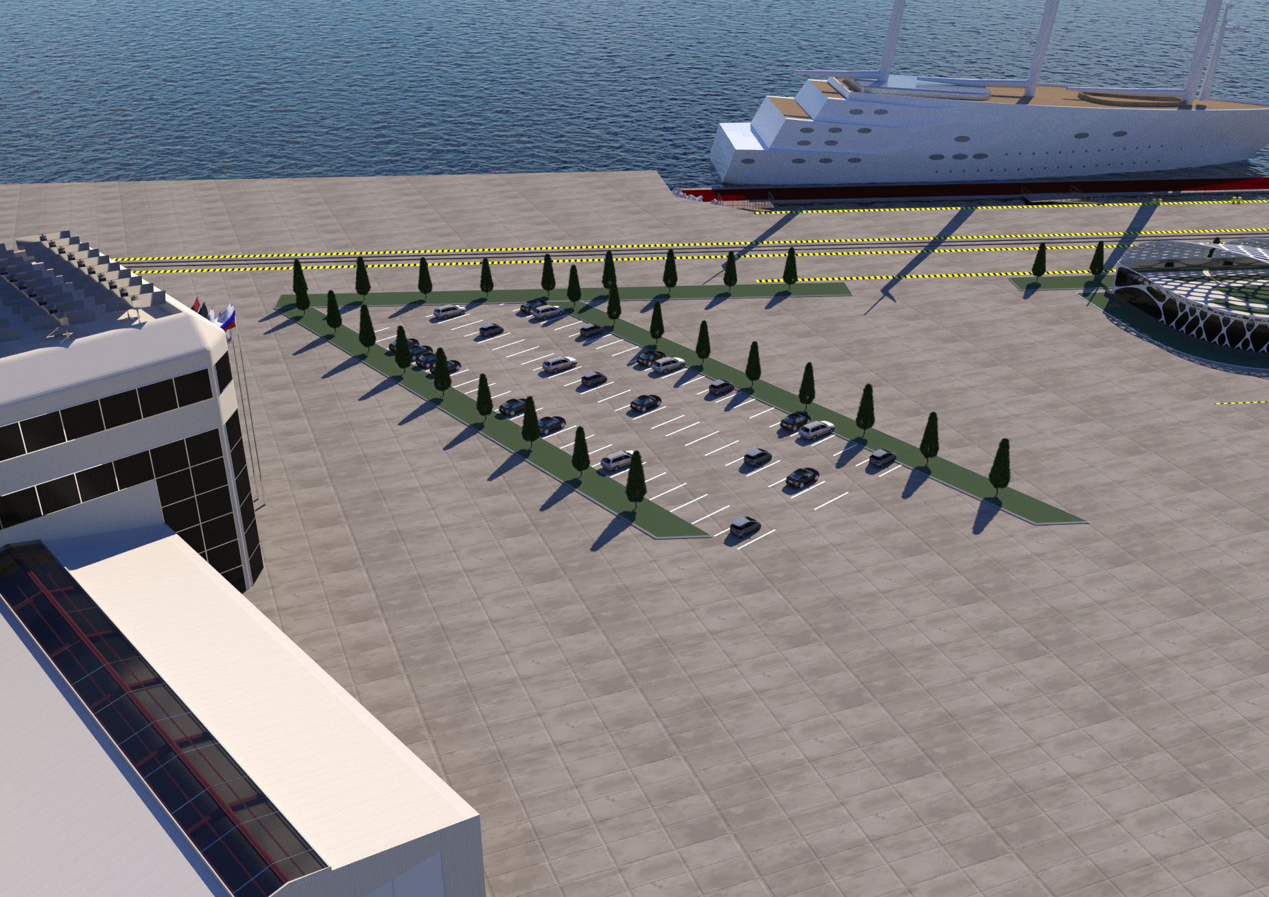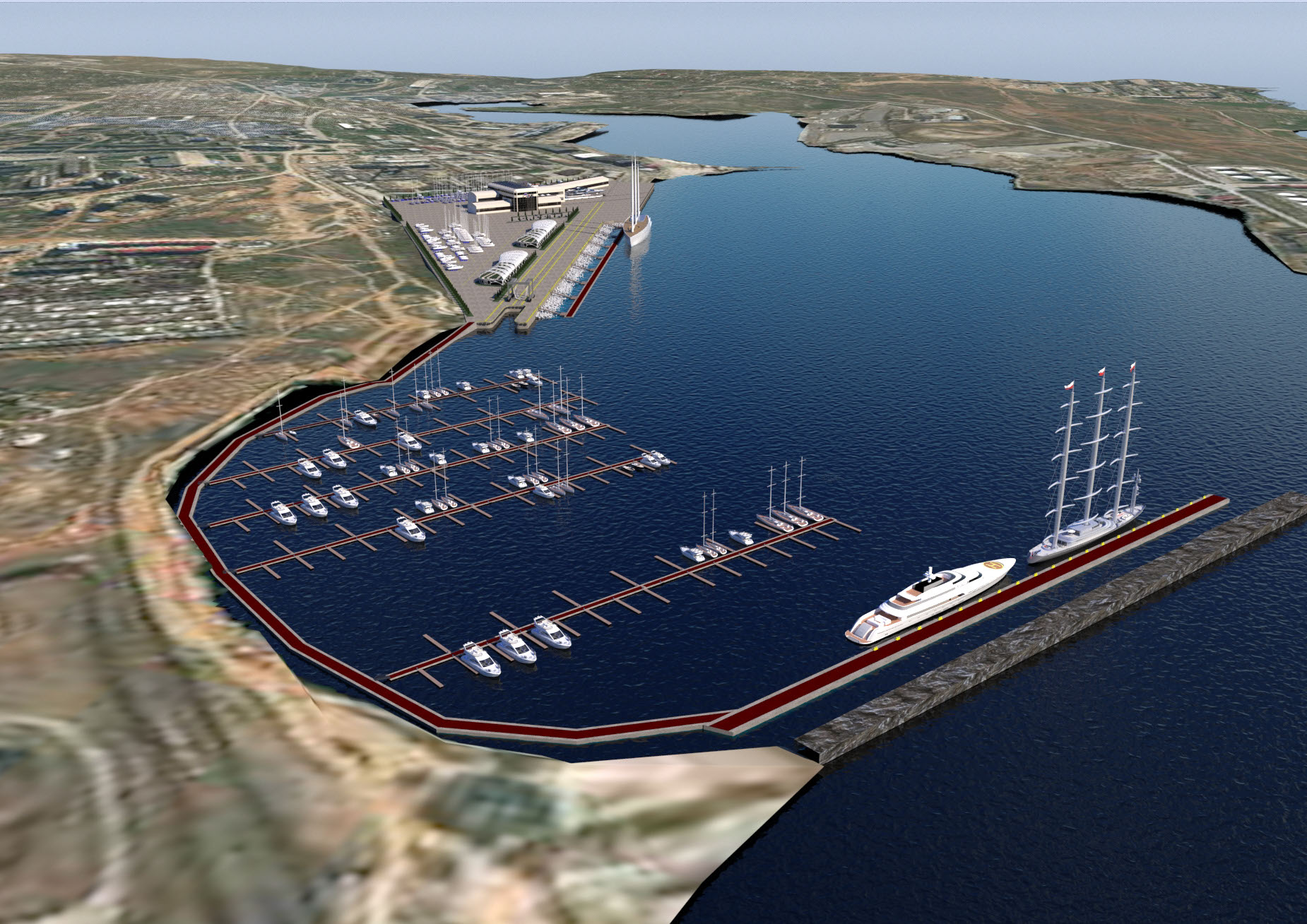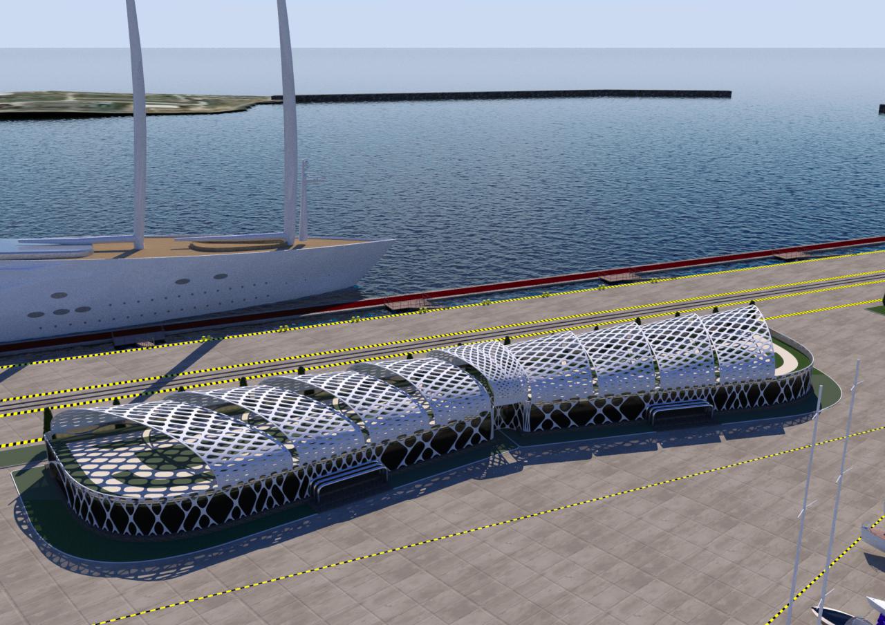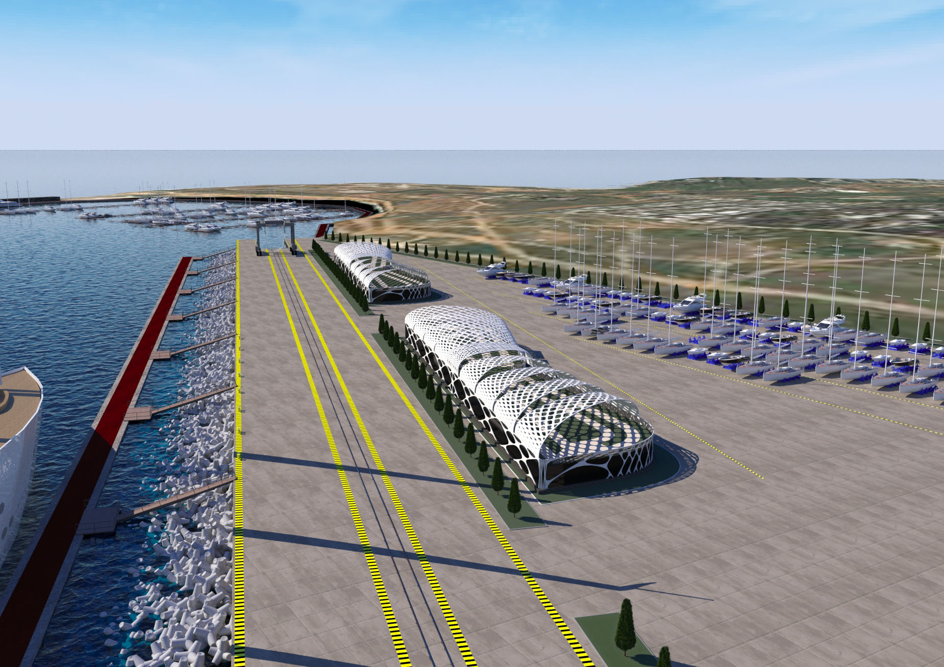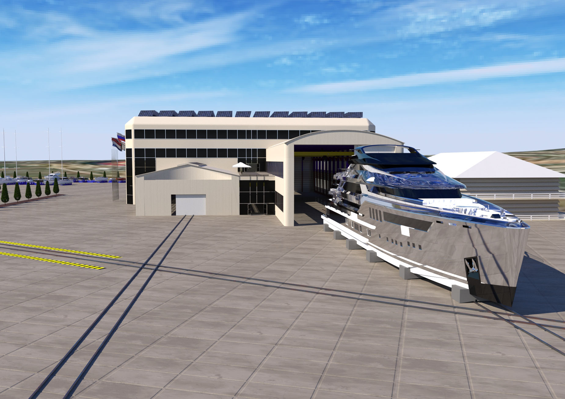 NAME PROJECT: "Kamysh Yachting Hub" includes: marina, yacht service center. . MANAGEMENT & ENGINEERING: YRoyalYachts Naval Architect&Marine Engineering Center ARCHITECTURE & DESIGN : YRoyalYachts Naval Architect&Marine Engineering Center  Length overall 400 m Width 400 m Capacity 500 places Ground storage - up to 600 yachts