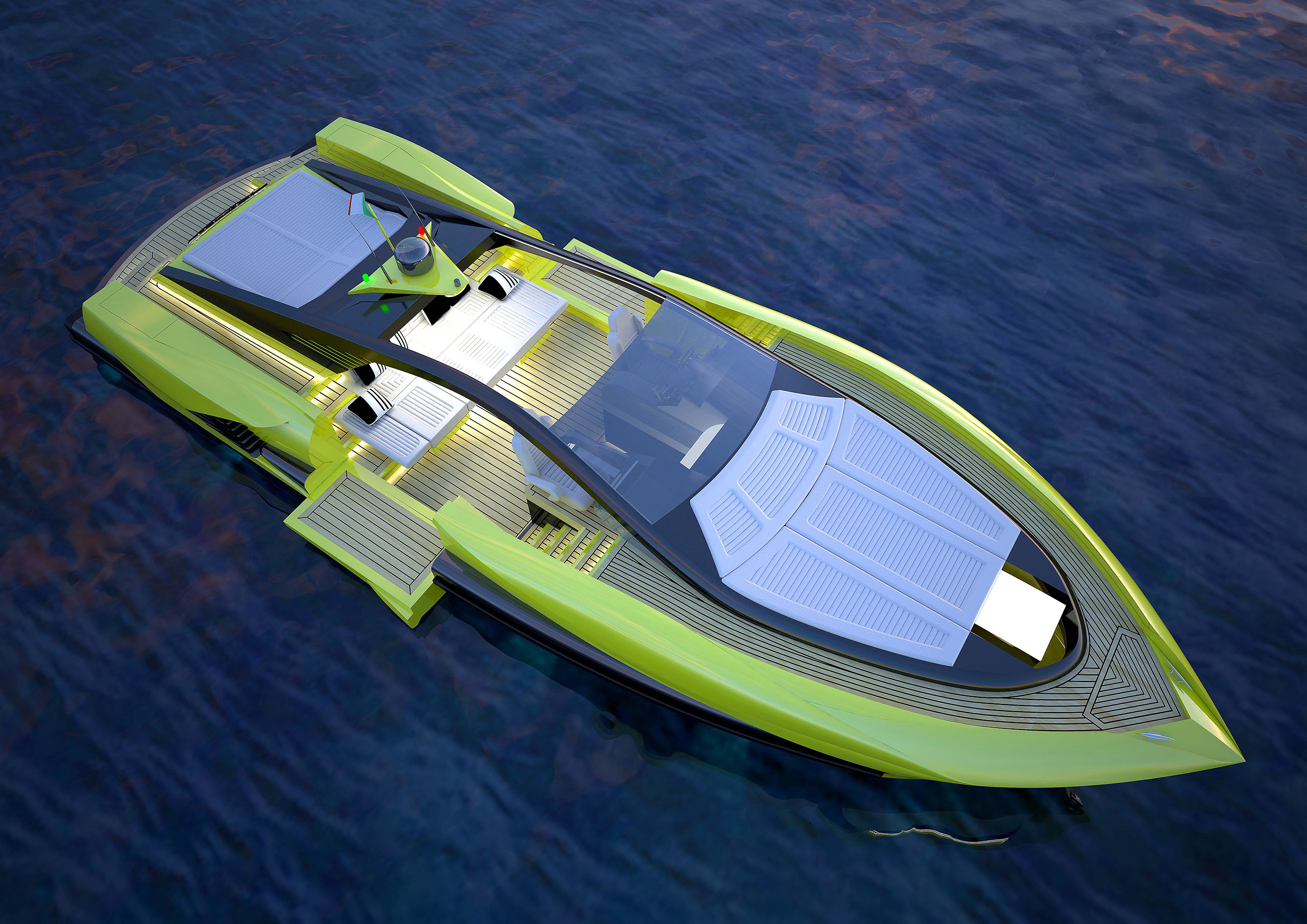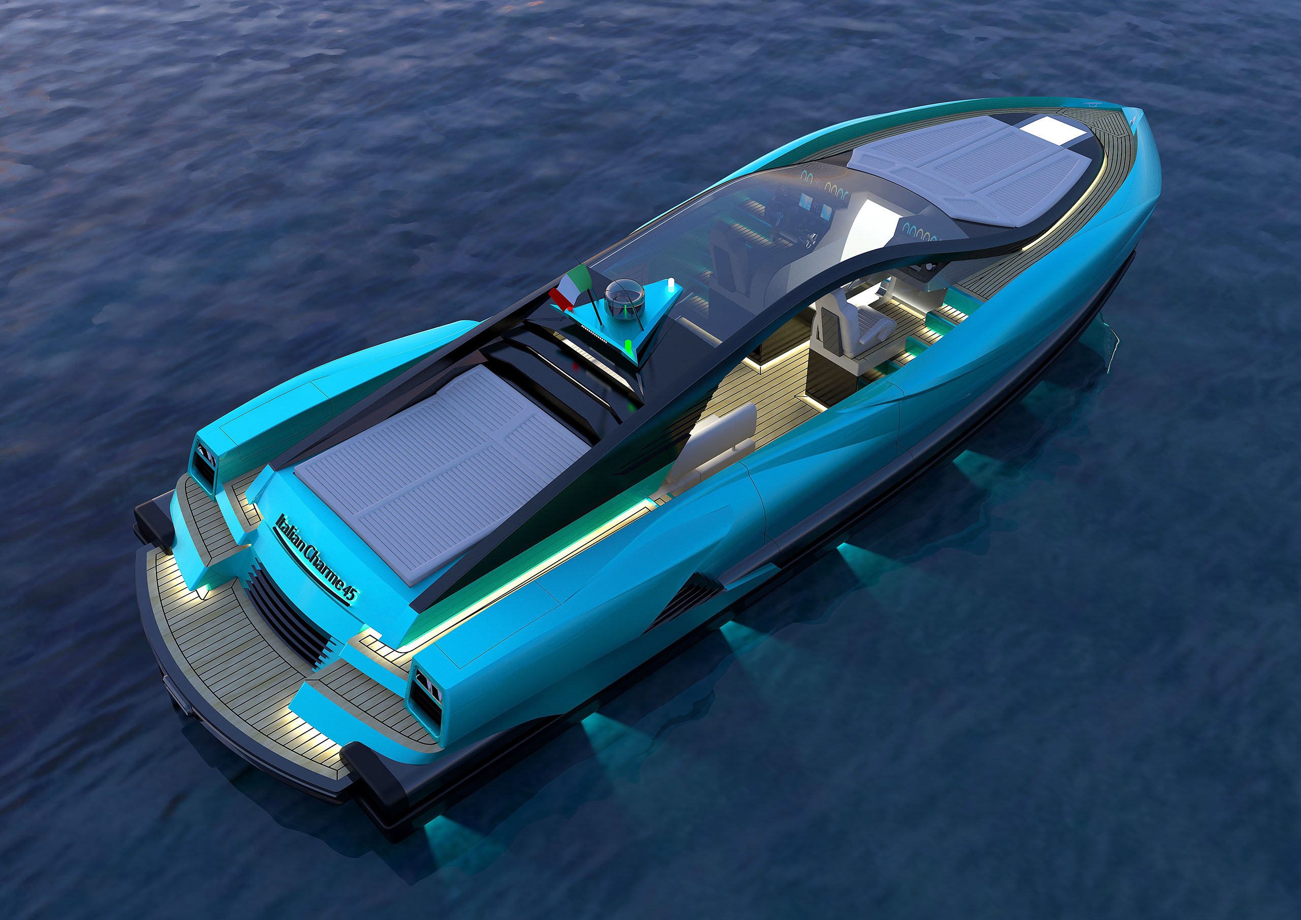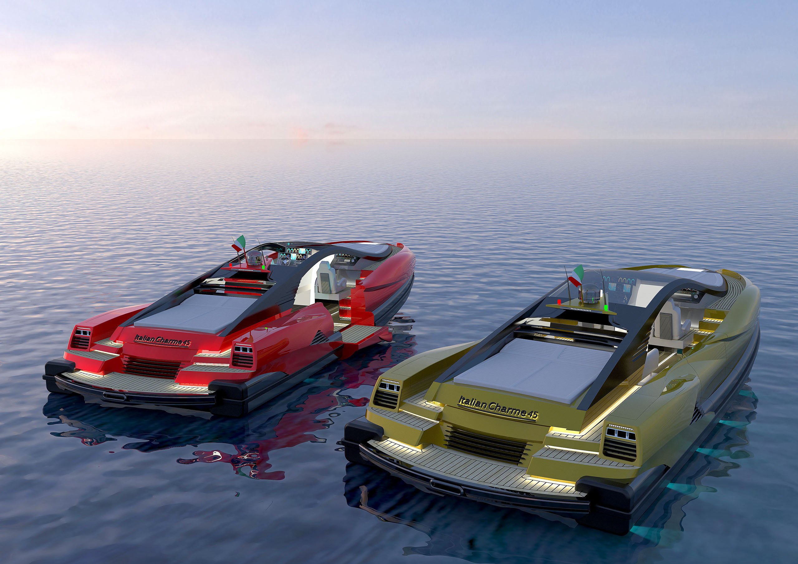 NAME PROJECT: Y 14 "CHARM ROYAL" SHIPYARD : YRoyalYachts CLASSIFICATION: CE MATERIAL: Composite MANAGEMENT & ENGINEERING: YRoyalYachts Naval Architect&Marine Engineering Center EXTERIOR / INTERIOR DESIGN : Pannone Architetti NAVAL ARCHITECTURE : Naval Engineering Cabes Yacht Length overall 14m / 45,93ft Beem overall 4,66m / 15,28ft Draft 0.7m / 2,29ft Full weight - 14000 kg / 30864 lb Fuel tank 760 liters / 200 US gal Water tanks 360 liters / 95 US gal Speed - 50 knots Engines - disel twin turbo 2x600 h.p.