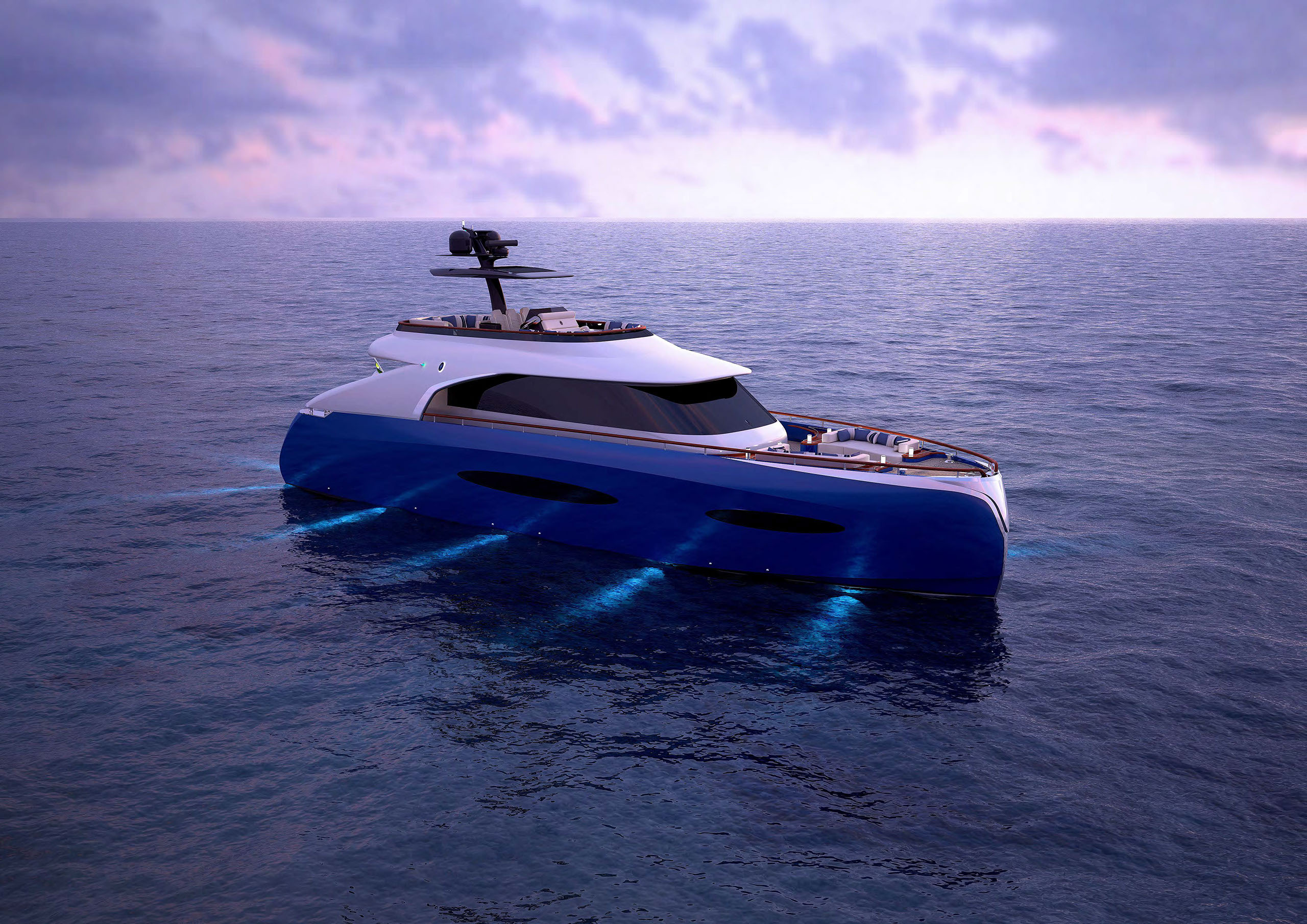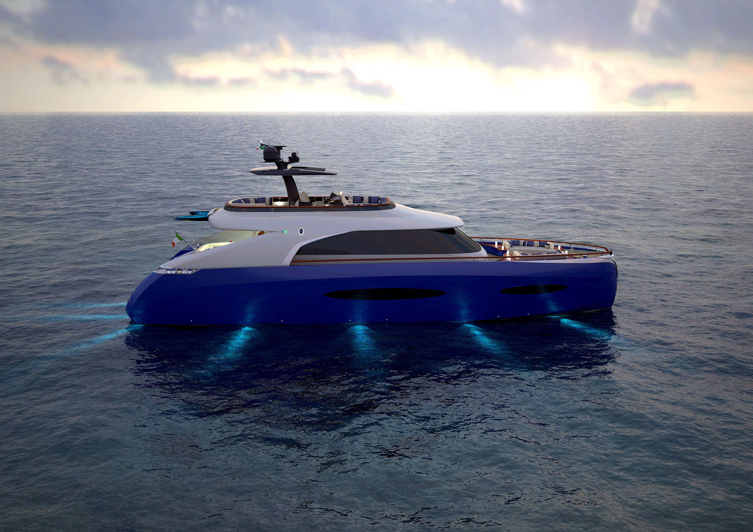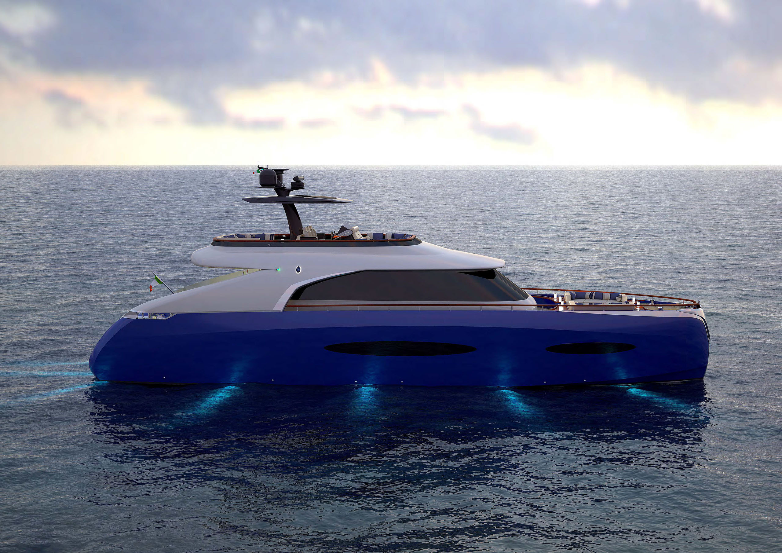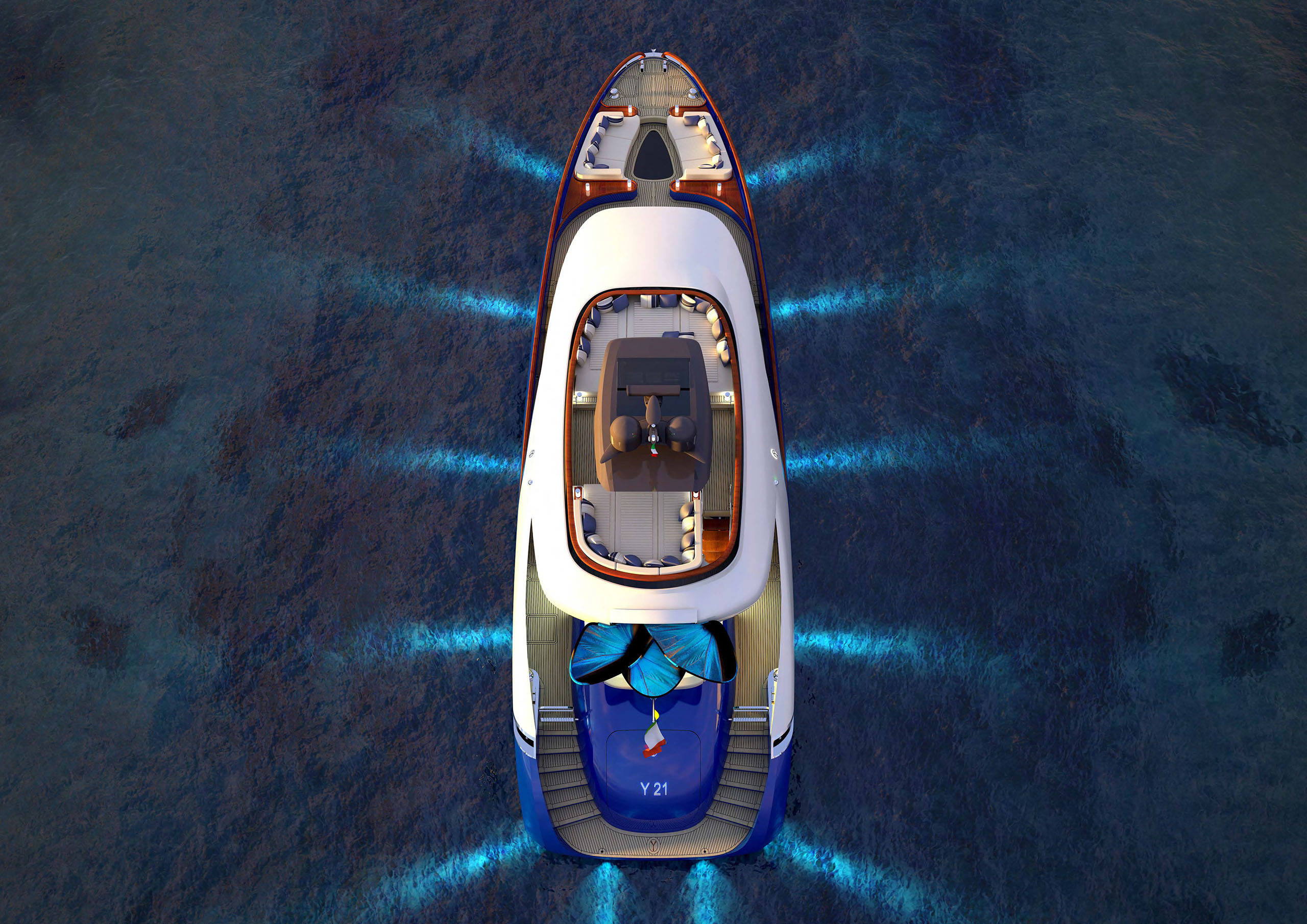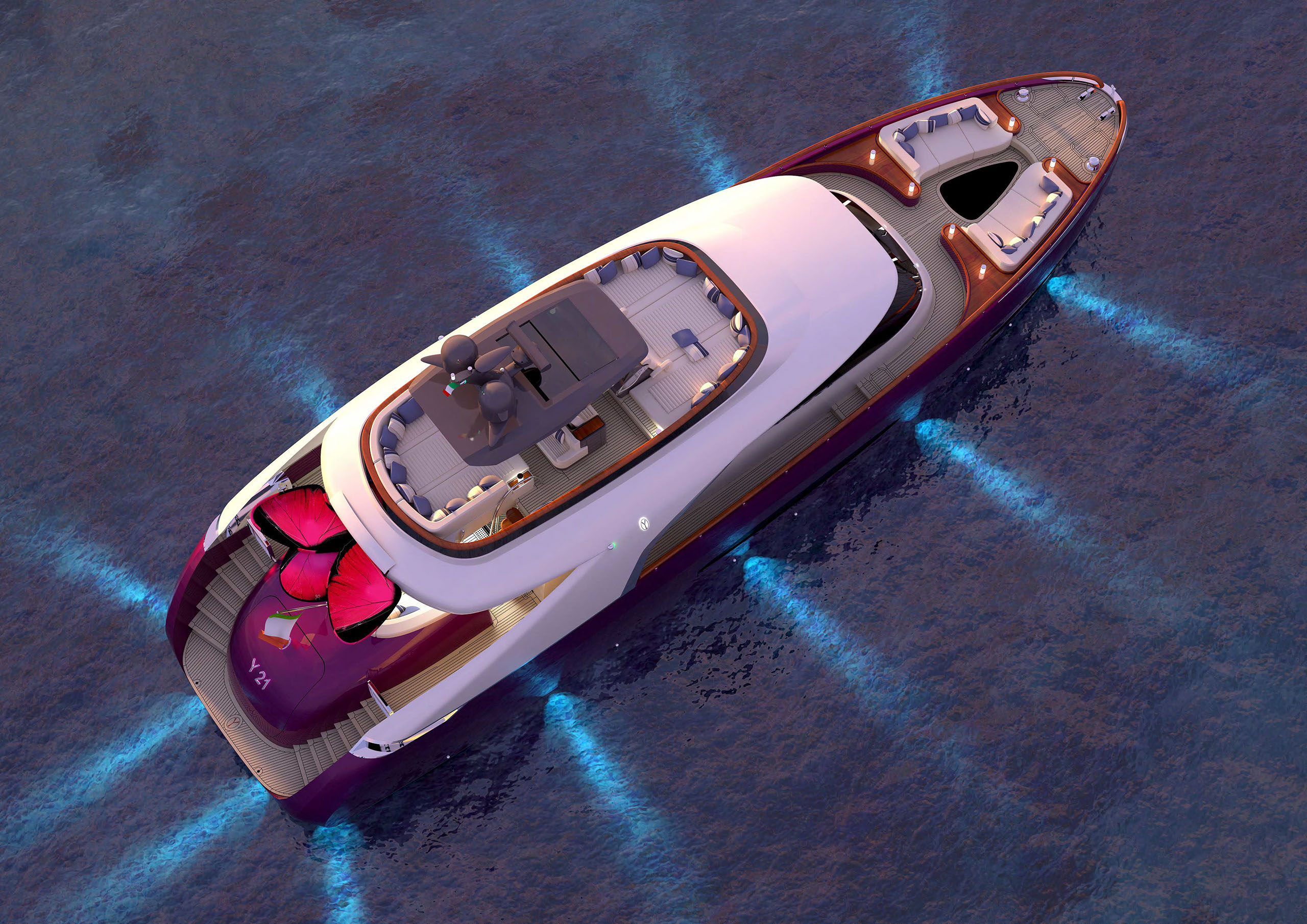 NAME PROJECT: Y 21 SHIPYARD : YRoyalYachts CLASSIFICATION: LLOYD + CE MATERIAL: Aluminium MANAGEMENT & ENGINEERING: YRoyalYachts Naval Architect&Marine Engineering Center EXTERIOR / INTERIOR DESIGN : Pannone Architetti NAVAL ARCHITECTURE : Naval Engineering Cabes Yacht Length overall 21m / 70ft Beem overall 6m / 19.7ft Draft 1.35m / 4.43ft Full weight - 60000 kg / 132277 lb Fuel tank 14 000 liters / 3 700 US gal Water tanks 2 200 liters / 581 US gal Cruising speed - 14 knots, max speed - 24 knots Cruising range - 3500 miles (10 knots) Engines - CAT C12.9 twin turbo 2x1000 h.p. 1 owner`s suite, 1 guest cabin, 1 crew cabin